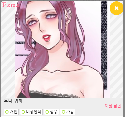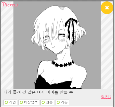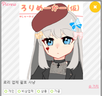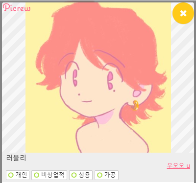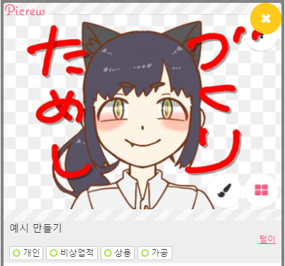 먼저 픽크루(Picrew)를 사용하는 유저들을 위해 상용 사용 가능 여부를 확인하는 방법을 알려드립니다. 위 이미지처럼 개인적 사용, 비상업적 사용, 상용, 가공에 O 표시를 확인해야 합니다. 가령 개인에만 O 표시가 있다면 비상업적인 용도로도 캐릭터를 활용할 수 없다는 뜻입니다.