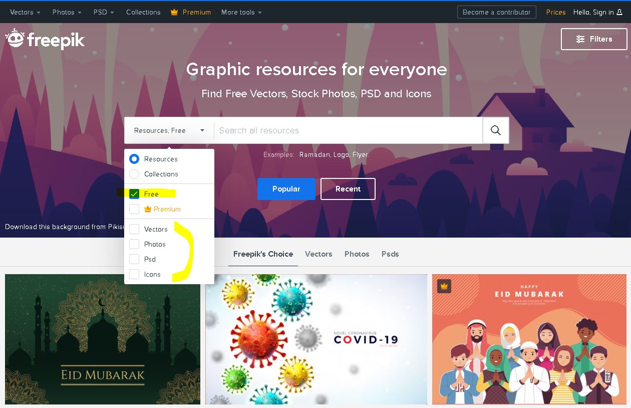 프리픽입니다. 일반 이미지도 많지만, 백터와 아이콘을 검색할 때 주로 사용하는 곳입니다. 검색할 때 프리를 꼭 체크하고 사용하시기 바랍니다. 처음엔 뭣도 모르고 검색했다가 와 이런 것도 무료이미지네? 했다가 무료 체크 안했다는 사실을 알고 실소했던 경험이 있습니다.