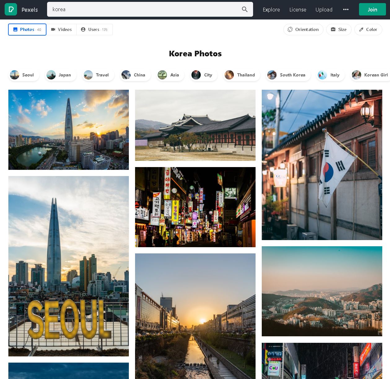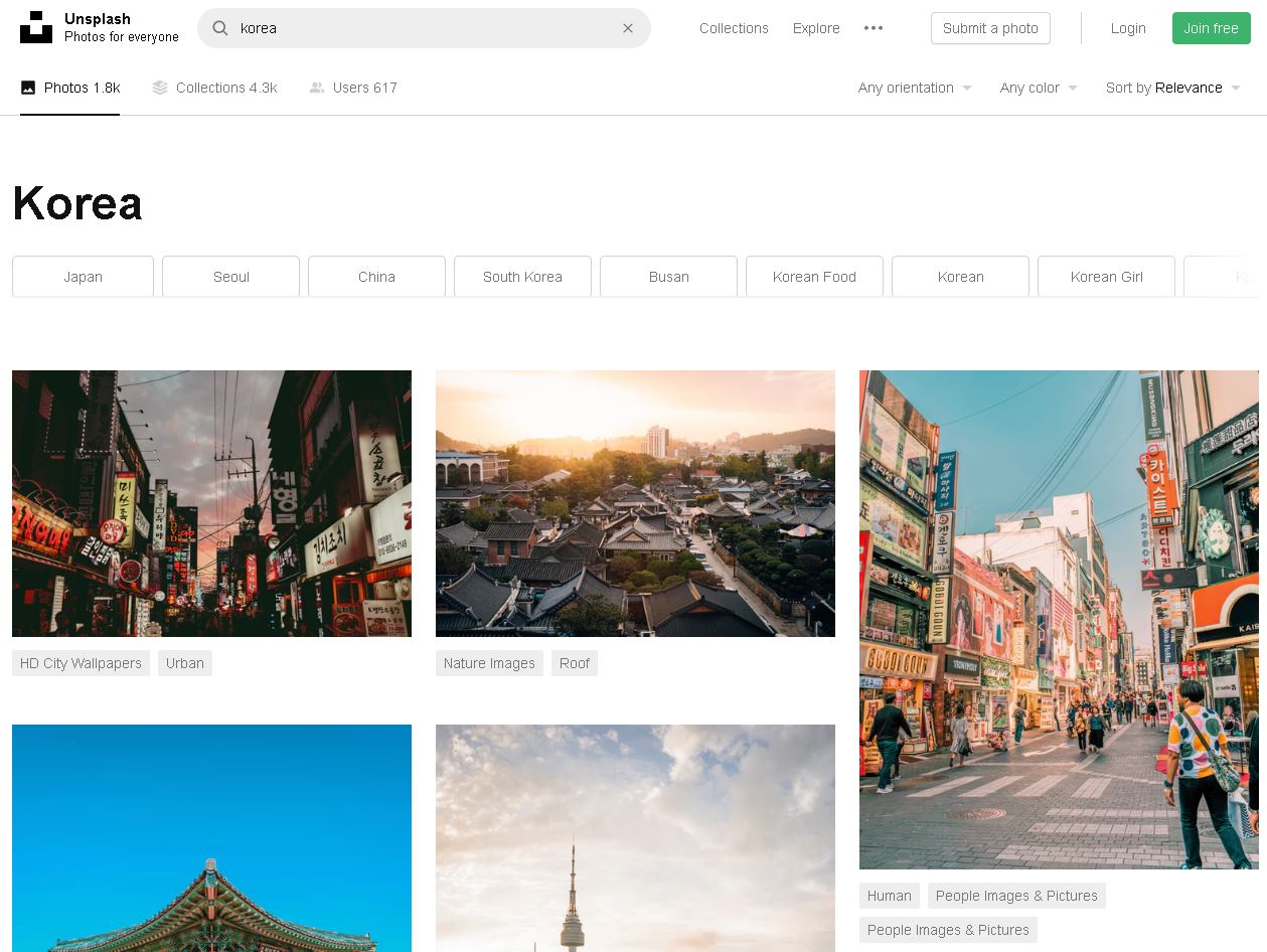 다음은 픽셀즈입니다. 픽사베이를 이용해보면 2% 아쉬운 부분이 있습니다. 고퀄이라곤 하지만 그럼에도 무료 이미지라는 인식 때문인지 부족한 사진도 상당합니다. 픽셀즈는 그런 단점을 보완한 양보단 질로 승부하는 느낌입니다. 한글 인터페이스를 지원하진 않지만, 단적인 예로 korea를 검색했을 때 픽사베이와 다르게 퀄리티가 좋은 이미지가 많이 뜨는 걸 볼 수 있습니다.